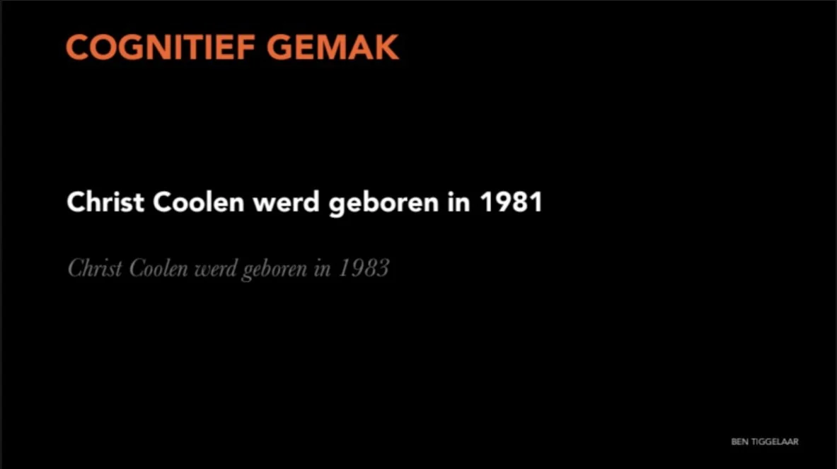 “Er zijn drie factoren die menselijk gedrag sturen”, vertelde de eerste spreker Ben Tiggelaar. “Cognitief gemak, motivatie en omgeving.” En dat eerste bewees hij met de vraag: Wanneer werd Christ Coolen geboren?